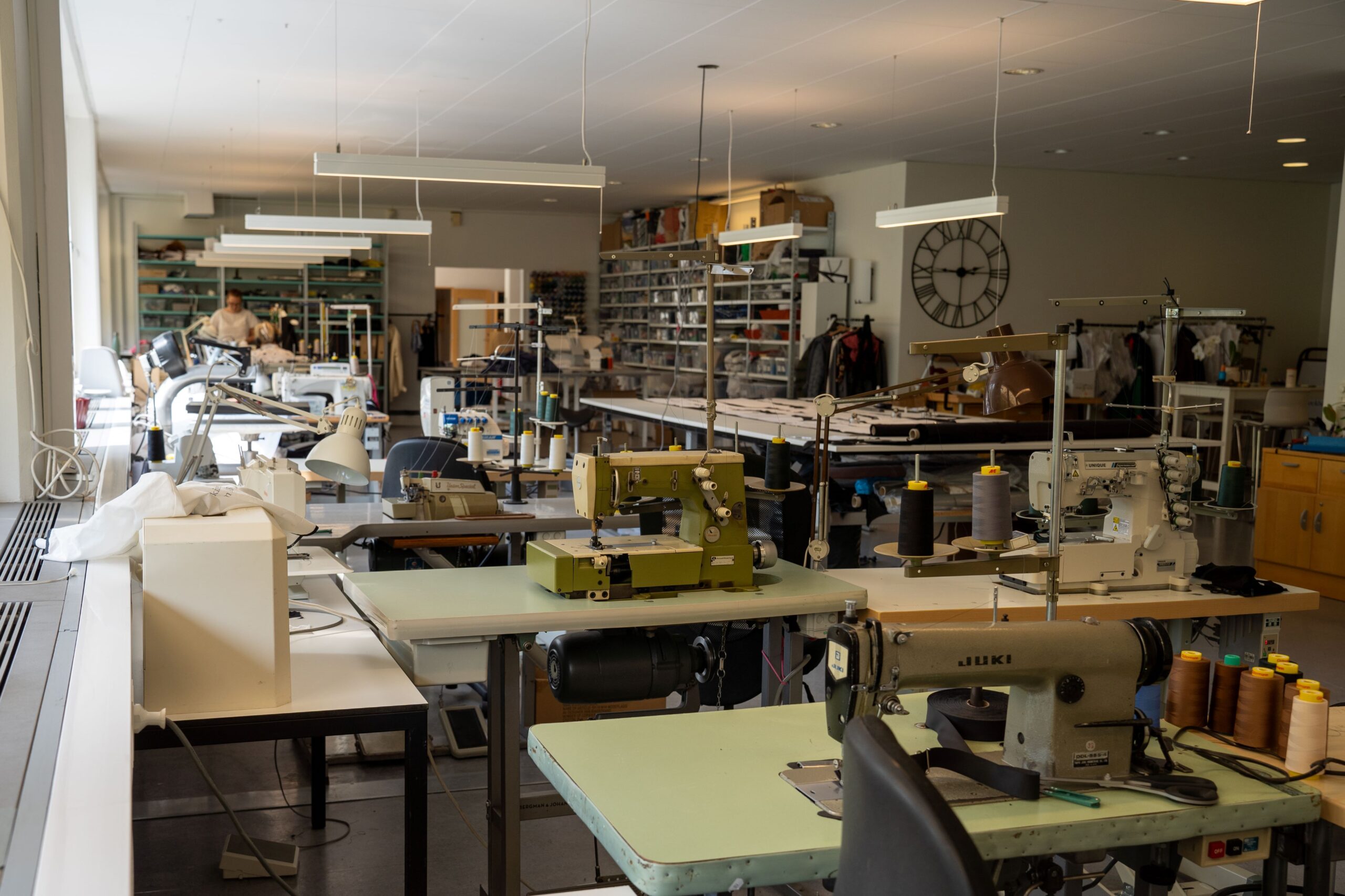 När vi är klara på M29gruppen åker vi vidare till Textilmaskineriet Stockholm i Bromma. På vägen dit beskriver Louise och Caroline att vi ska åka till en fabrik där själva sömnadsproduktionen av mössan och handledsvärmaren i Re:used by Taiga-kollektionen kommer ske. Från gatan ser Textilmaskineriets lokaler långt ifrån ut som någon fabrik, snarare som ett företagskomplex från 60-talet. Men i vanlig ordning ska man inte döma boken efter sitt omslag. Högst upp i huset är verksamheten i full gång och i den småskaliga sömnadsfabriken pågår en tillverkning som vi inte ser mycket av i Sverige idag.